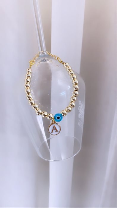 צמיד חרוזים מוזהב-תוספת אות לבחירה ועין כחולה.